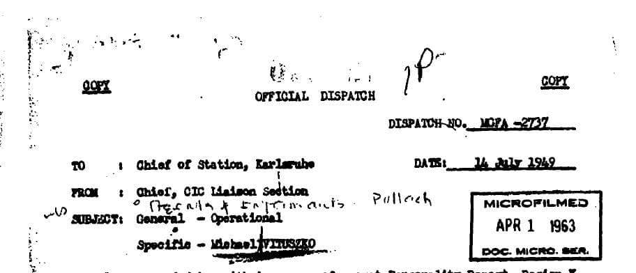 В Советской историографии утверждают, что командир «Черного кота» Михаил Витушко погиб еще в 1945-м. Но как же тема предательства и крови в Беларуси не могла обойтись без Вильнюса, Берлина и Вашингтона. «Белсат» еще в конце 2016 года обнародовал материал ЦРУ. В документах опровергали версию гибели Витушко. Разведка со ссылкой на сына предателя Сергея Ерша уверяла, что Михаил Витушко умер 27 апреля 2006 года.