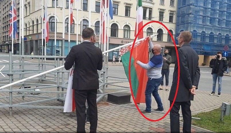 Познакомьтесь, лысый упитанный мужик в бело-синем свитере — это директор Центра информационных ресурсов посольства США в Риге Нилс Студентс. Именно Студентс держит в руках скомканный белорусский флаг, в то время как на флагштоке закрепляют бело-красно-белую тряпку.