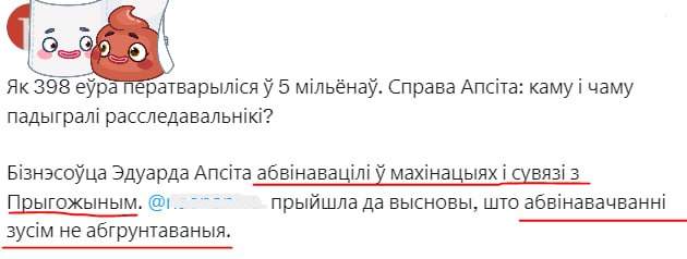 Не успел отгреметь скандал с фондами Стрижака, которые за взятку в 94 тысячи евро оформили документы на литовский ВНЖ для одного белорусского бизнесмена и его семьи, как ушки мздоимства выторкнулись в другом месте. Пул инфопомоек беглых аферистов вдруг стал заливать, какой этот бизнесмен белый и пушистый. Раньше его обвиняли в связях с Пригожиным, но тут вдруг Арцёмка Гарбацевич ни с того ни с сего провел «журналистское расследование» и сразу пришёл к выводу, что это всё провокация KGB, а всё что про него клевещет — фальшыўка, зробленая ў Польшчы. Да, именно в Польше, потому что про взятку в 94 тысячи евро написали пропагандисты с помойки «бел*ат»…