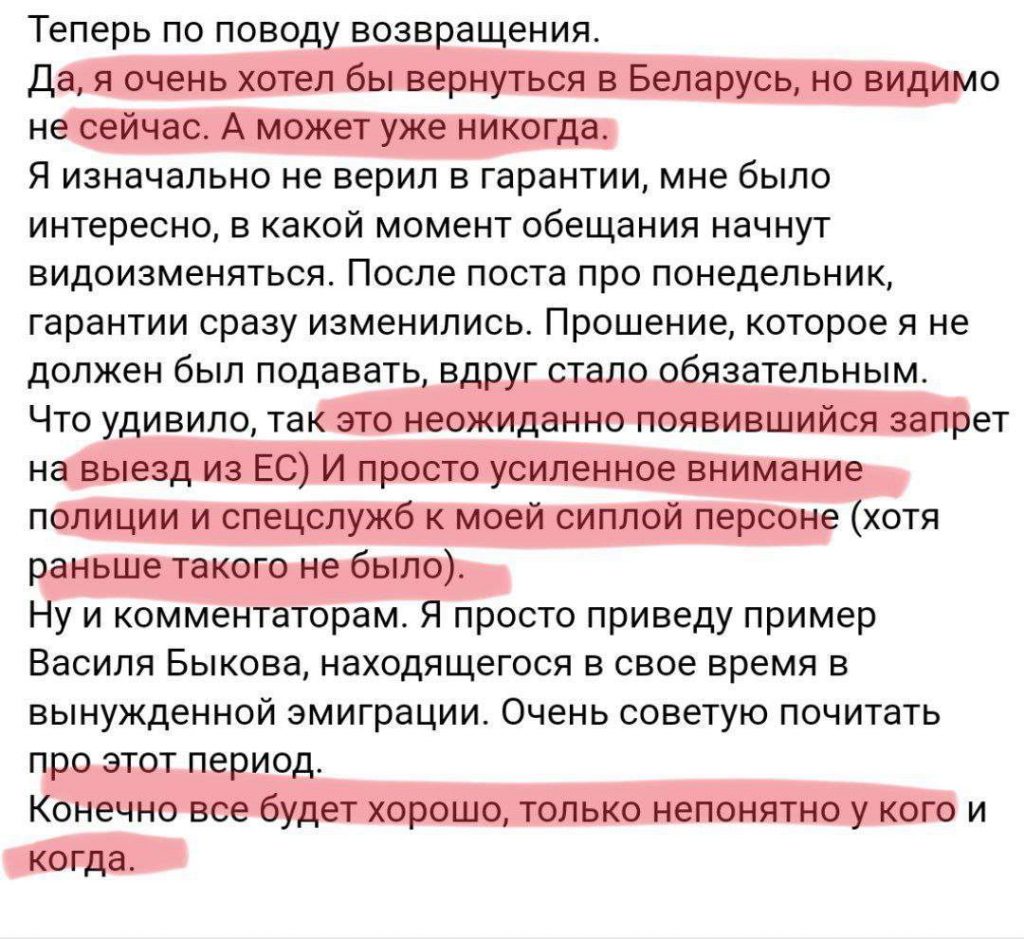 Сегодня сообщество паразитов выдохнуло с облегчением: передумал. Пишет в пэйсбуке, что после заявления о намерении вернуться за ним стали следить местные спецслужбы и полиция. А ещё запретили выезд(!!!) из ЕС. Демократия-с. Хотя врёт скорее всего, чтоб лицо сохранить. Ишь какая важная птица — следят и запрещают! Самомнение у этого беглого ещё то, с Быковым себя сравнивает. Прямо картина маслом: «я и другие великие».