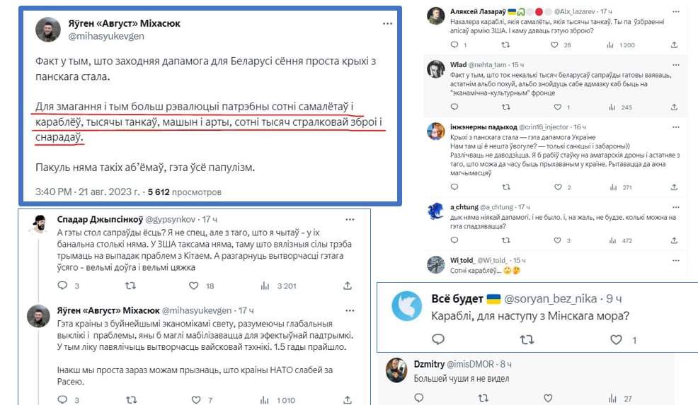 Михасюк как боец и тиктокер был говно, но, сбежав из банды, вдруг возомнил себя стратегом, видя бой издалека. И пишет такой про перемогу над Лукашенко: «Для змагання і тым больш рэвалюцыі патрэбны сотні самалётаў і караблёў, тысячы танкаў, машын і арты, сотні тысяч стралковай зброі і снарадаў«.