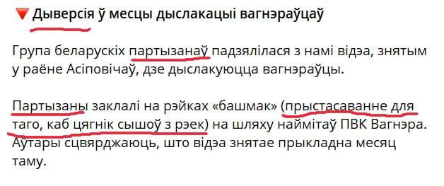 Экстремисты «б@@сат» со ссылкой на бчб-террористов разместили ролик, на котором, якобы, месяц назад под Осиповичами недалеко от лагеря ЧВК «Вагнер» на ж/д пути было установлено приспособление для того, чтобы поезд сошел с рельсов.