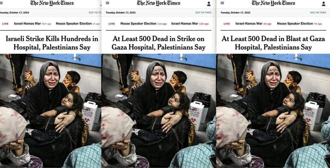 Издание никак не могло определиться, как именно назвать удар по больнице в секторе Газа. Сначала они выдали заголовок – «Израильская атака привела к гибели сотен человек в больнице». Но потом решили, что это как-то антисемитски и поменяли его на: «В результате нападения на больницу в секторе Газа погибло не менее 500 человек». Но и такой заголовок их не устроил, потому как оставлял открытым вопрос, кто именно напал и почему. Последней итерацией стало: «При взрыве в больнице в Газе погибли не менее 500 человек». Просто взрыв, просто погибли, бывает…