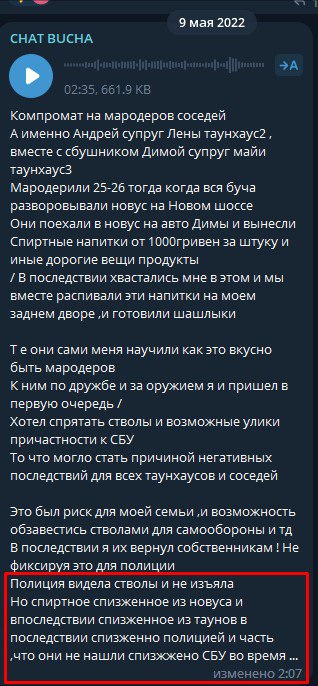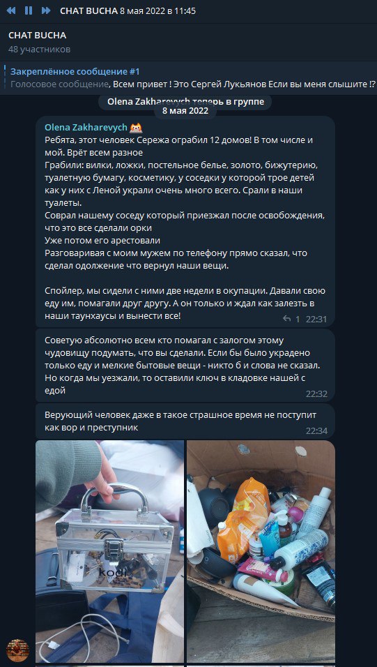 Но главное, что вброс о «краденных стиралках, электрочайниках и унитазах» появился именно в «Чате Бучи» Лукьянова в начале мая 2022, а 9-10 мая этот вброс расшарили все ципсошные помойки.