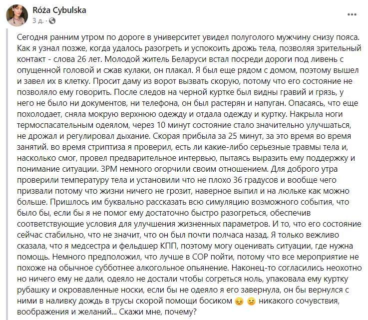 Жительница Варшавы Роза Цибульска рассказала, как однажды вечером заметила на улице полуголого змагара. Он стоял под проливным дождем, сжимал кулаки и плакал. Мужчина был в носках, без штанов и, возможно, без трусов (хотя инфопомойки стыдливо переврали: «с голым торсом»). Человек был упорот в ноль: нечего не помнил, имени назвать не смог — промямлил только, что из Беларуси. Документов и телефона у него тоже не было.