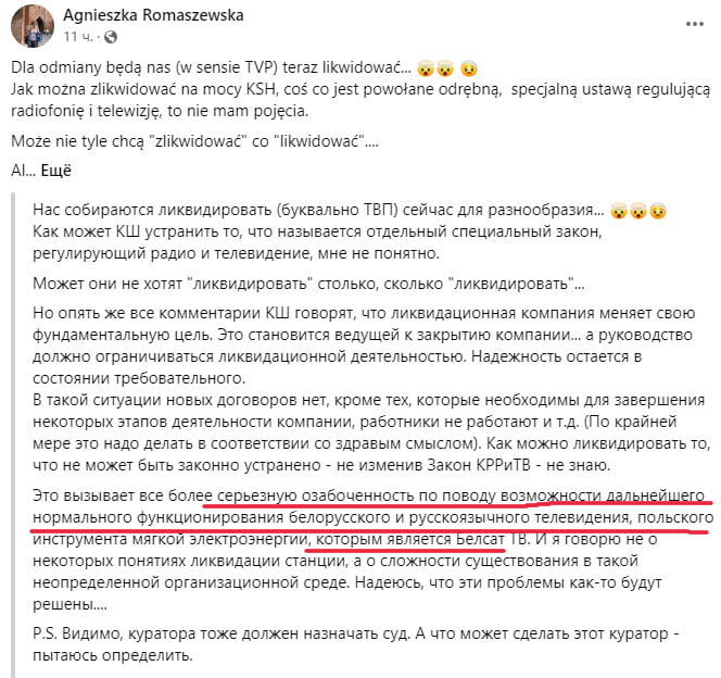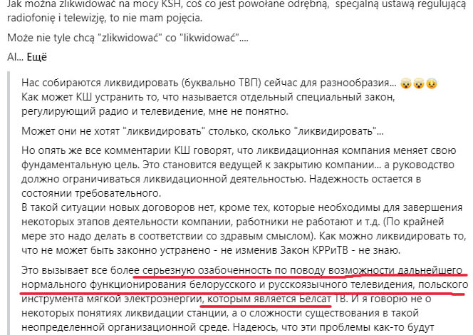 «Они нас (в смысле TVP) сейчас ликвидируют… 🤯 🤯 🤕 Все это вызывает все более серьезные опасения по поводу возможности дальнейшего нормального функционирования вещательного телевидения на Востоке на белорусском и русском языках, инструмента польской soft power, которым является Belsat TV.