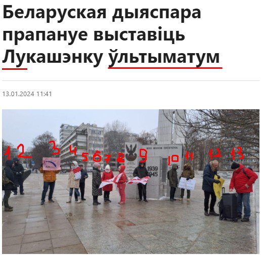 На этот раз 13 змагаров в минусовую температуру 2 часа простояли возле польского Сейма. А все для того, чтобы «рэжым» Лукашенко амнистировал экстремистов. И если этого не произойдет, то они объявят «рэжыму» ультиматум.