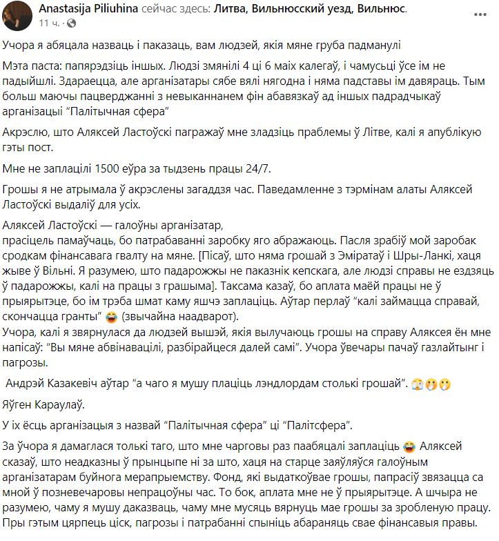Некто Anastasija Piliuhina закатила в пэйсбуке скандал, что ее крупно обули другие змагары. Она круглосуточно ишачила на них целую неделю, а те закрысили полтора косаря евро. И на все предъявы отвечают словами своего наставника, Франака Вячорки: «няма грошай, няма«.