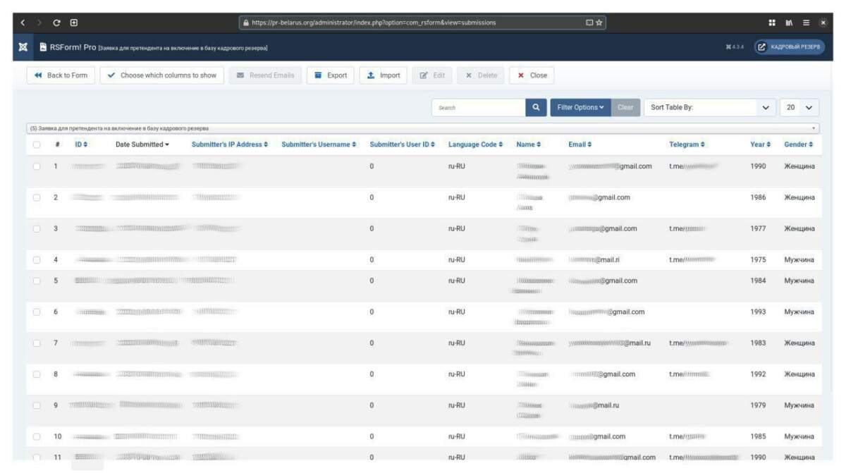 После эпичной утечки данных всех участников этой бандгруппы Юрась распинался на всех помойках, что это всё поклёп и выдумки пропаганды. А знающие люди опубликовали скрин админки к сайту «кадрового резерва», куда «анонимно и безопасно» писали некоторые дебилы. Это страница плагина rsform, который собирает заявки от обманутых вкладчиков ждунов. Для удобства сбора личных данных беглыми мерзавцами даже предусмотрена специальная форма, где указаны id, адрес оправителя, электронная почта, дата, пол, год рождения и прочие установочные данные, облегчившие работу силовикам при записи стендапов счастливых “анонимных управленцев новой Беларуси”.