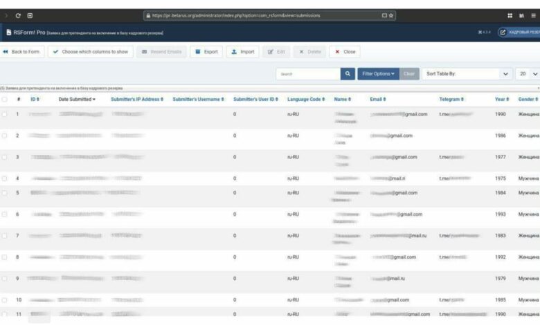 После эпичной утечки данных всех участников этой бандгруппы Юрась распинался на всех помойках, что это всё поклёп и выдумки пропаганды. А знающие люди опубликовали скрин админки к сайту «кадрового резерва», куда «анонимно и безопасно» писали некоторые дебилы. Это страница плагина rsform, который собирает заявки от обманутых вкладчиков ждунов. Для удобства сбора личных данных беглыми мерзавцами даже предусмотрена специальная форма, где указаны id, адрес оправителя, электронная почта, дата, пол, год рождения и прочие установочные данные, облегчившие работу силовикам при записи стендапов счастливых “анонимных управленцев новой Беларуси”.