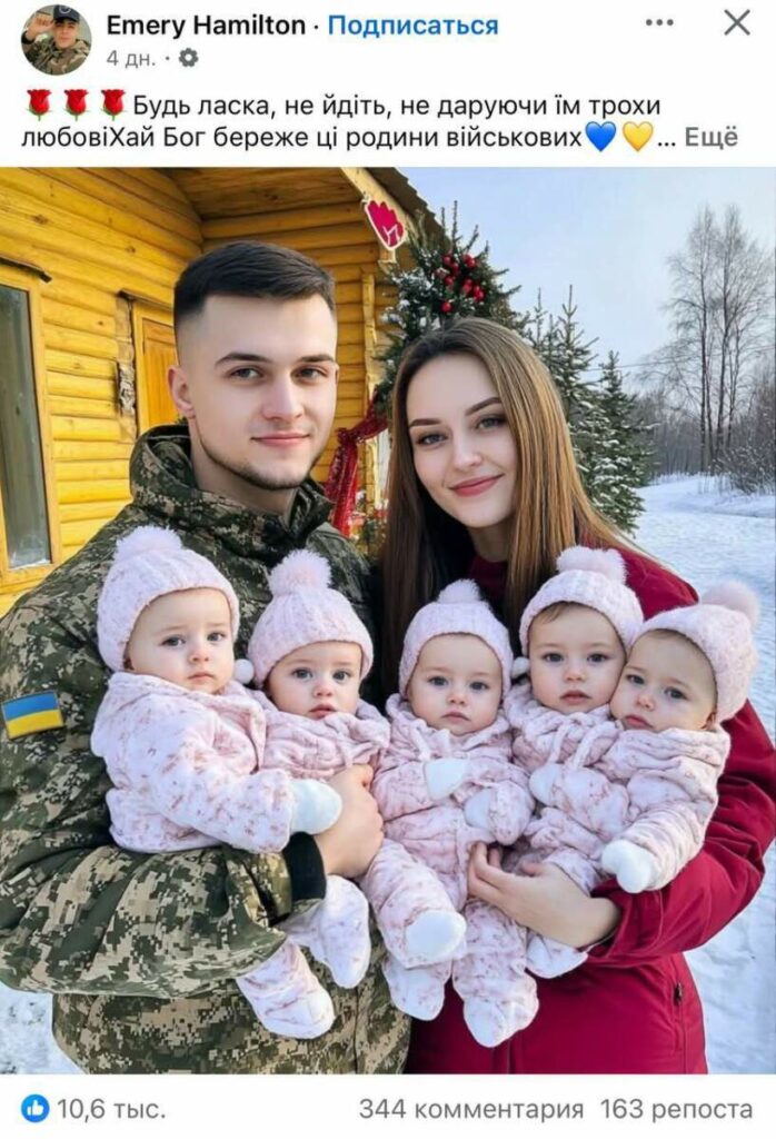 Мол, батька на войне, а мамка воспитывает пятерых (!) близнецов, ожидая мужа с победой, до котороц рукой подать. Через неделю будут штурмовать Москву. Украинцы прямо дуреют от этой милоты, даже не понимая, что это довольно топорная подделка.