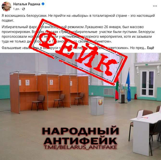 Базирующиеся за границей экстремисты продолжают клепать неуклюжие фейки о том, что «белорусы бойкотировали выборы, никто голосовать не ходил, участки были пустые, выборы сфальсифицированы». Так, редактор экстремистского формирования «Хартия 97» Н.Радина на своей странице в ФБ разместила «очередное доказательство массового игнора выборов 26 января» — картинку с безлюдным избирательным участком.