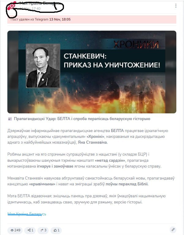 Публикация в Telegram-канале, связанном с ЛГБТ-активистом и по совместительству «пресс-секретарём» беглого политика Хуана Гарсия — неожиданно исчезла. А всё потому, что в ней восхвалялся нацистский преступник Станкевич — один из самых кровавых коллаборационистов времён Второй мировой войны.