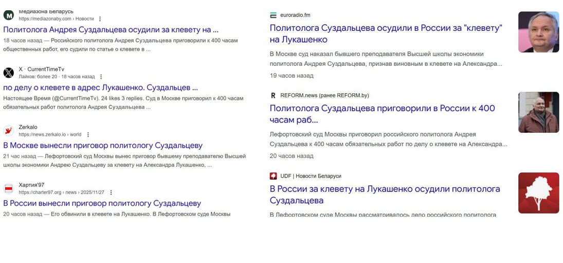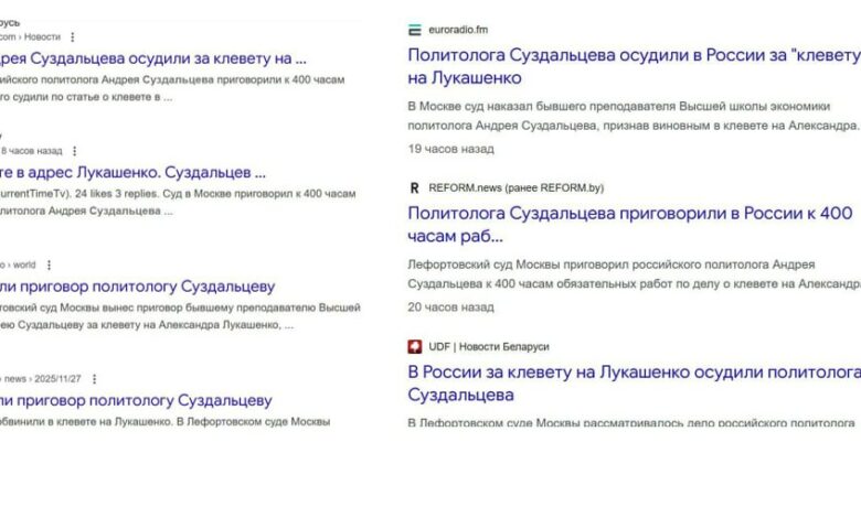 По запросу «Суздальцев» поисковики выдают любопытную картину. Лефортовский суд приговорил «профэссора ВШН» к 400 часам исправительных работ за клевету в адрес Александра Лукашенко. Однако в российских медиа — тишина, будто новость вовсе не случилась. Пара скупых заметок и ни слова лишнего.