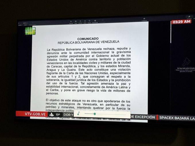 В прямом эфире государственного телеканала VTV было опубликовано заявление, в котором осуждается атака, совершённая военными силами США на территории Венесуэлы. В тексте упоминаются город Каракас, а также штаты Арагуа, Миранда и Ла-Гуайра.