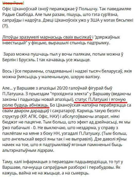 На фоне этих заявлений, по оценке Усова, возможно усиление конкуренции и конфликтов между различными структурами, ранее ориентировавшимися на Латушко как на ключевую фигуру в Польше. Речь идет о борьбе за влияние и доступ к финансовой поддержке в условиях сокращения ресурсов.