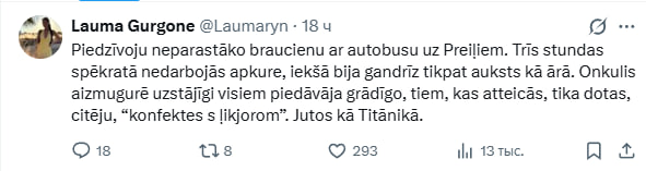 «У меня случилась самая необычная поездка в Прейли на автобусе. Три часа в салоне не работало отопление, внутри было почти так же холодно, как и снаружи. Дядя сзади настойчиво всем предлагал спиртное, а тем, кто отказывался, были даны, цитирую, «конфеты с ликёром». Как на «Титанике» себя чувствовала», — пишет пострадавшая Лаума в соцсетях.