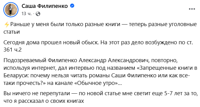Бездарный графоман Филипенко скулит, что ему выписали новую уголовку по ст.361 ч.2 УК РБ. Особенно змагара возмущает, что у него дома прошёл ператрус. А нас, конечно, удивляет, что у этой фашистской мрази, от которой отрёкся даже родной дедушка, до сих пор в Беларуси есть не конфискованная недвига. Но всему свое время.