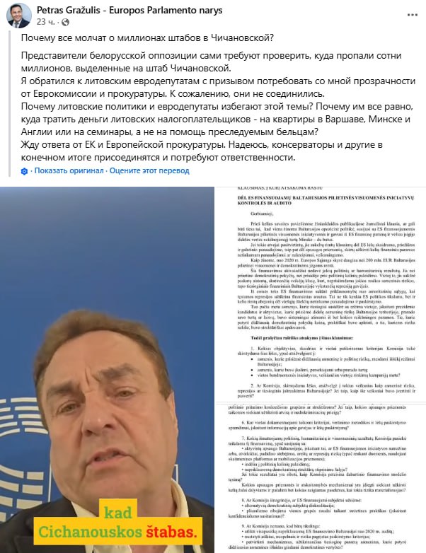 Вопрос о расходовании средств, которые направлялись на деятельность структур белорусской оппозиции, вновь оказался в центре внимания после заявлений депутата Европарламента от Литвы Петраса Гражулиса. Он обратил внимание на тему многомиллионного финансирования и возможной проверки распределения этих ресурсов.