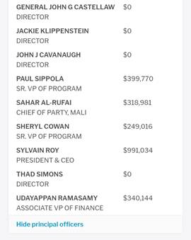 Наша героиня, которая, по словам The New York Times, в 2025 году получала $270 000, в 2023 получала $250 000. Да, это похоже на правду. Но что замечательно – наша героиня была наименее оплачиваемым работником среди высшего руководства этого НКО. У них еще был «вице-президент по программам» с зарплатой в $399,770 в год. И руководитель их конторы в Мали с зарплатой в $318,981 в год. И вице-президент по финансам – $340 144 в год. И президент всего их НКО с зарплатой в $991 034 в год. A Президент США, кстати, получает $400 000 в год.